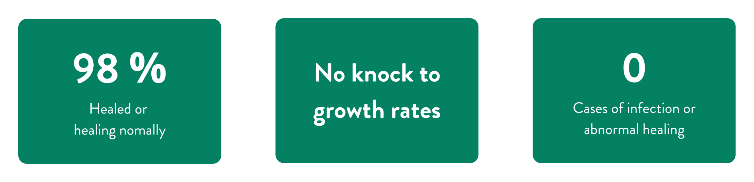 For context, disbud sites typically take 54 to 63 days to fully heal1,2. Seeing 98 % healed or healing normally at day 7 is well ahead of that curve, and the staff perceived healing to the happening at a faster rate than with previous products. No calves displayed abnormal healing or signs of infection following disbudding, which is better than the ~6 % observed in peer-reviewed studies3.